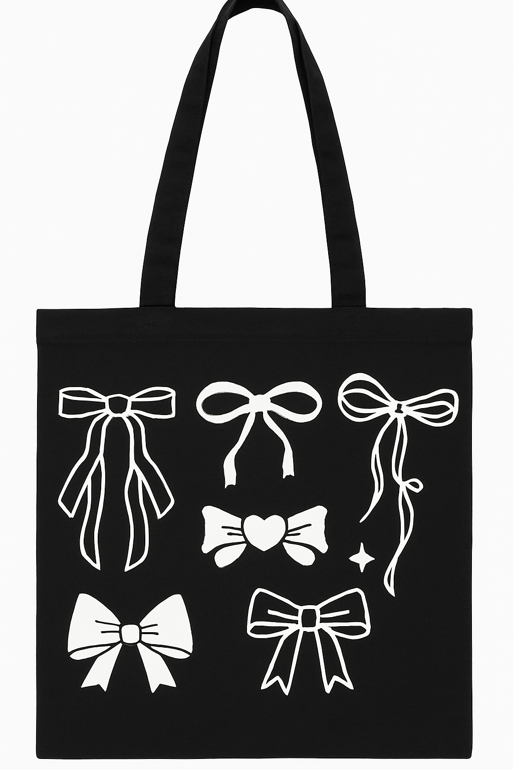 Denna eleganta och mångsidiga tygväska kombinerar stil med funktion. Med sitt rosett tryck blir den en fräsch detalj i vardagen – perfekt för shopping, stranden eller skolan.